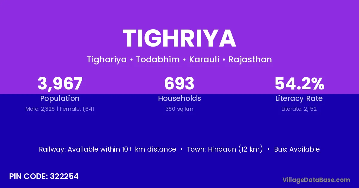 Hindaun (12 km) is the nearest town to Tighriya village for major economic activities and is located approximately 12 km away.