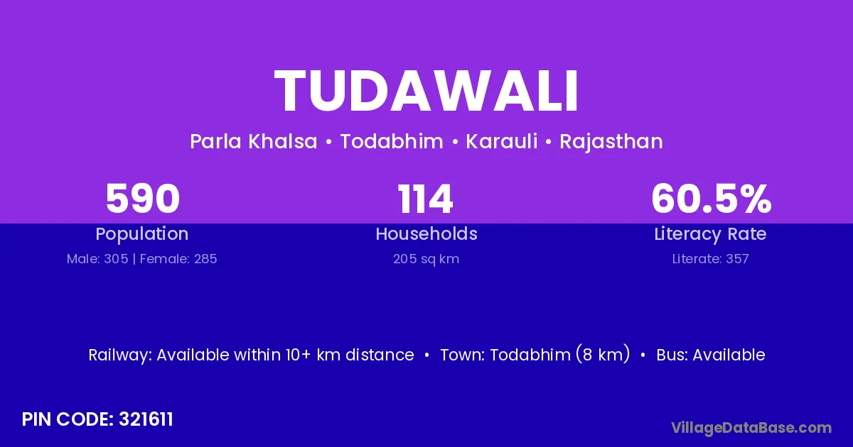 Todabhim (8 km) is the nearest town to Tudawali village for major economic activities and is located approximately 8 km away.