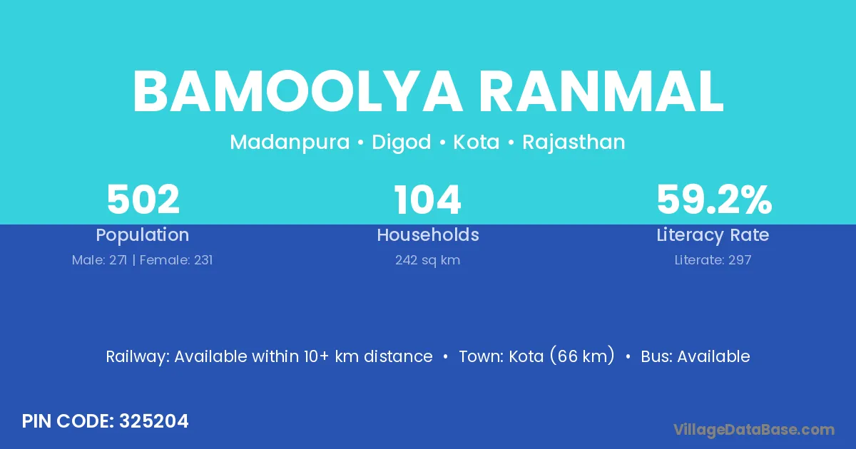 Kota (66 km) is the nearest town to Bamoolya Ranmal village for major economic activities and is located approximately 66 km away.