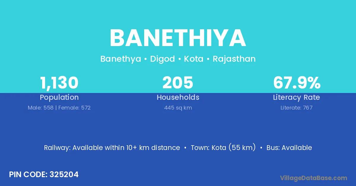 Kota (55 km) is the nearest town to Banethiya village for major economic activities and is located approximately 55 km away.