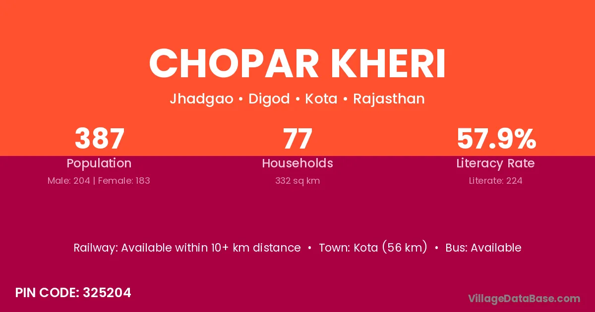 Kota (56 km) is the nearest town to Chopar Kheri village for major economic activities and is located approximately 56 km away.