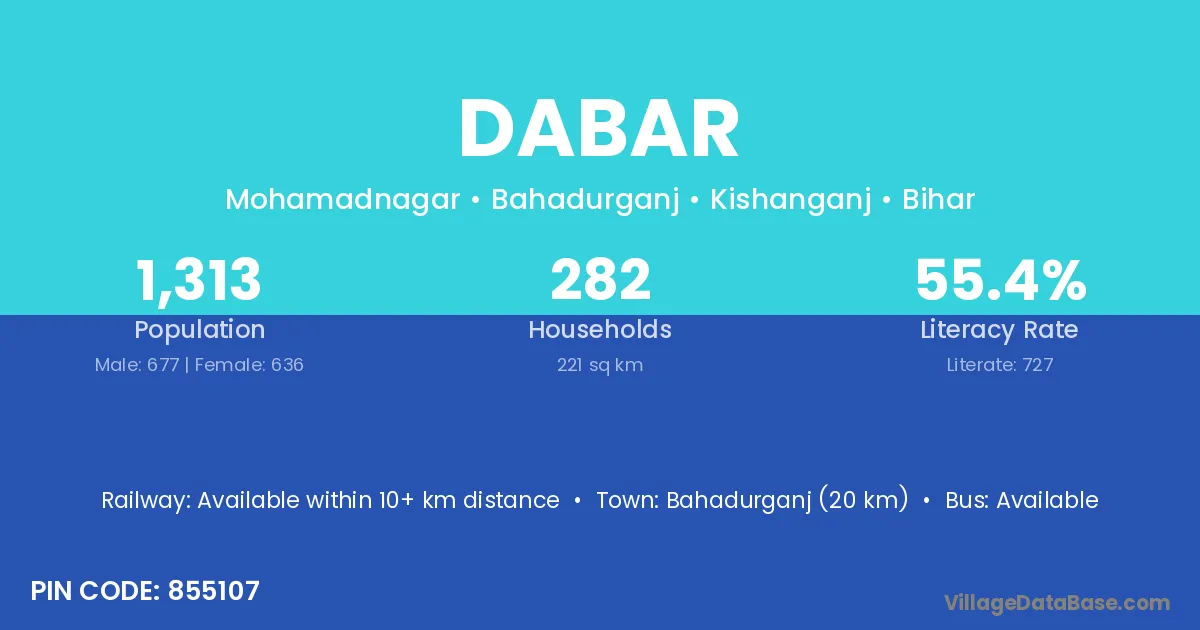 Dabar village has a total population of 995 people, of which 500 are males and 495 are females.