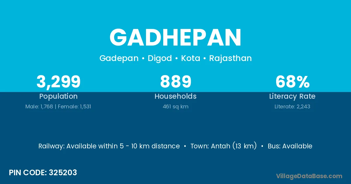 Antah (13 km) is the nearest town to Gadhepan village for major economic activities and is located approximately 13 km away.