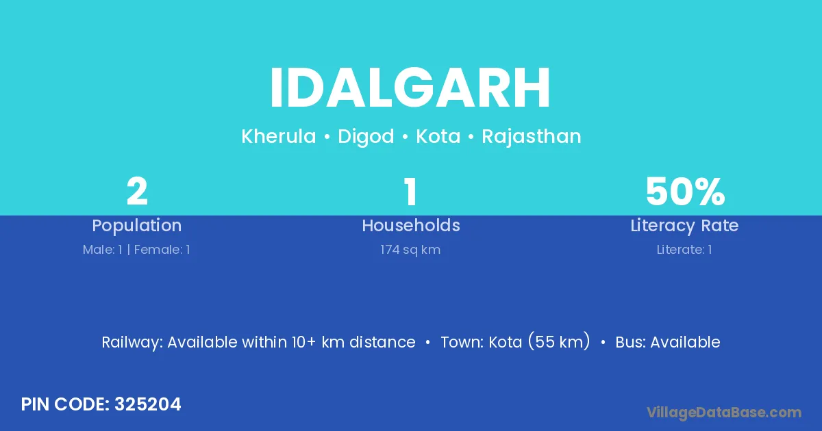 Kota (55 km) is the nearest town to Idalgarh village for major economic activities and is located approximately 55 km away.