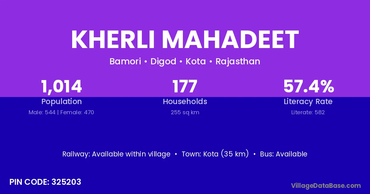 Kota (35 km) is the nearest town to Kherli Mahadeet village for major economic activities and is located approximately 35 km away.