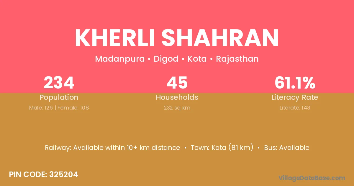 Kota (81 km) is the nearest town to Kherli Shahran village for major economic activities and is located approximately 81 km away.