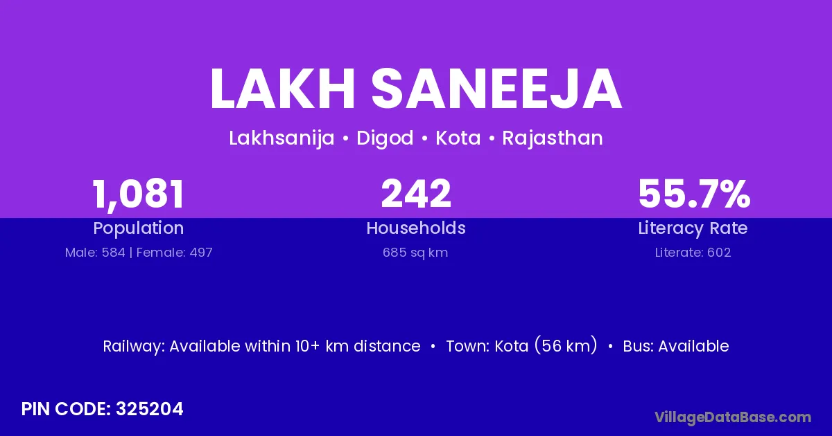 Kota (56 km) is the nearest town to Lakh Saneeja village for major economic activities and is located approximately 56 km away.