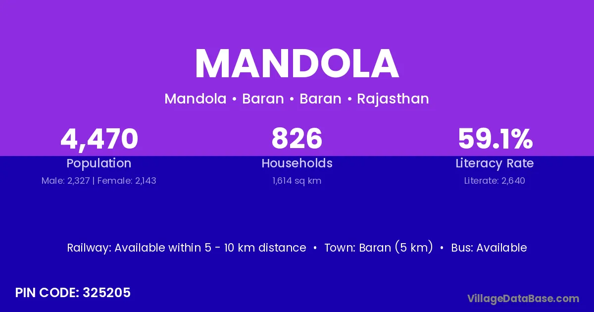 Kota (30 km) is the nearest town to Mandola village for major economic activities and is located approximately 30 km away.