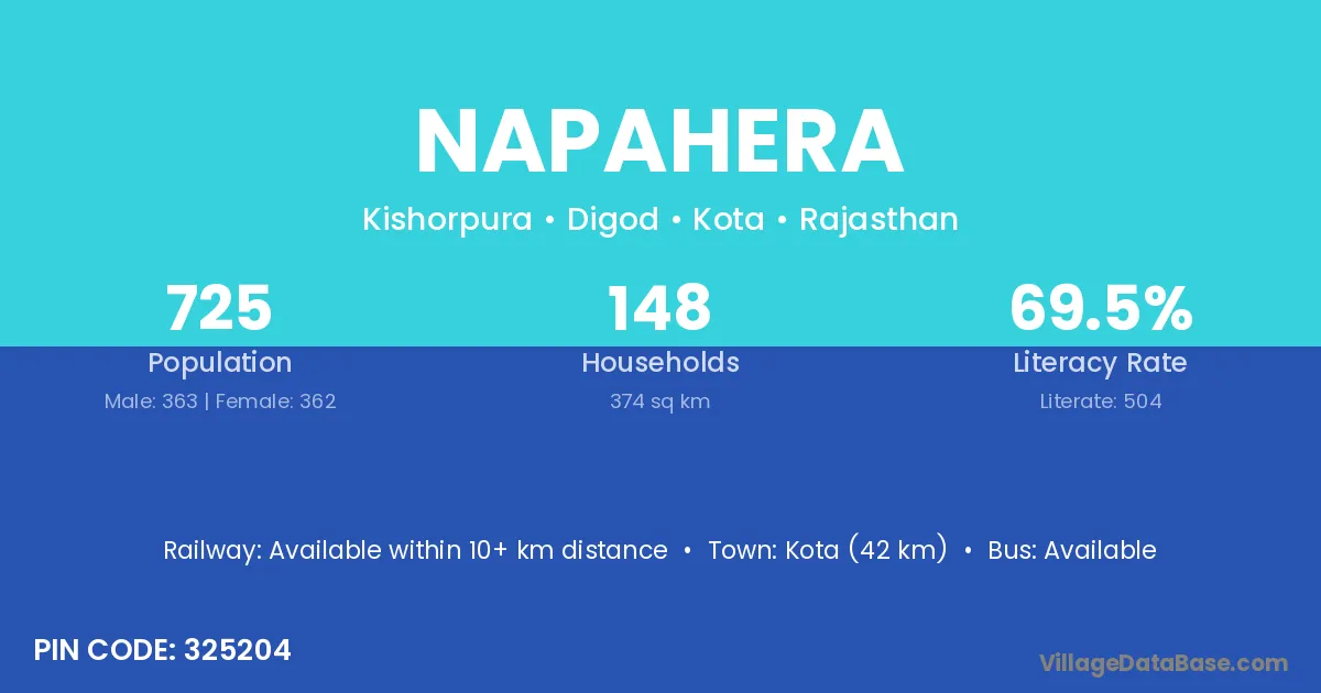 Kota (42 km) is the nearest town to Napahera village for major economic activities and is located approximately 42 km away.