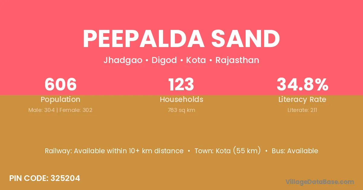Peepalda Sand village has a total population of 606 people, of which 304 are males and 302 are females.