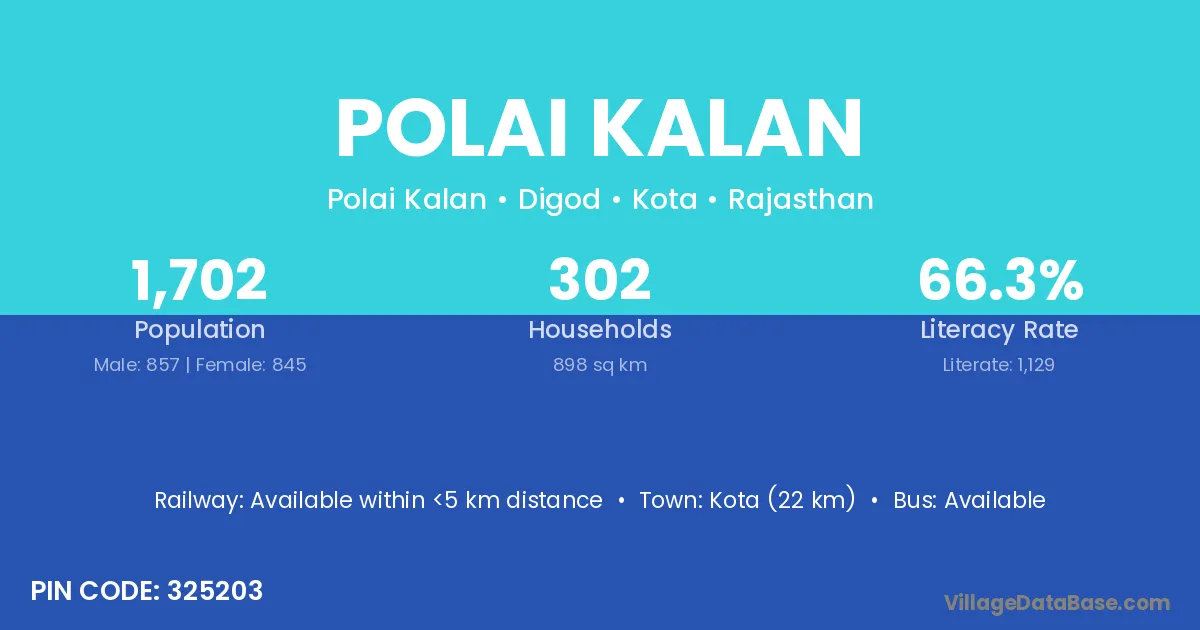 Kota (22 km) is the nearest town to Polai Kalan village for major economic activities and is located approximately 22 km away.