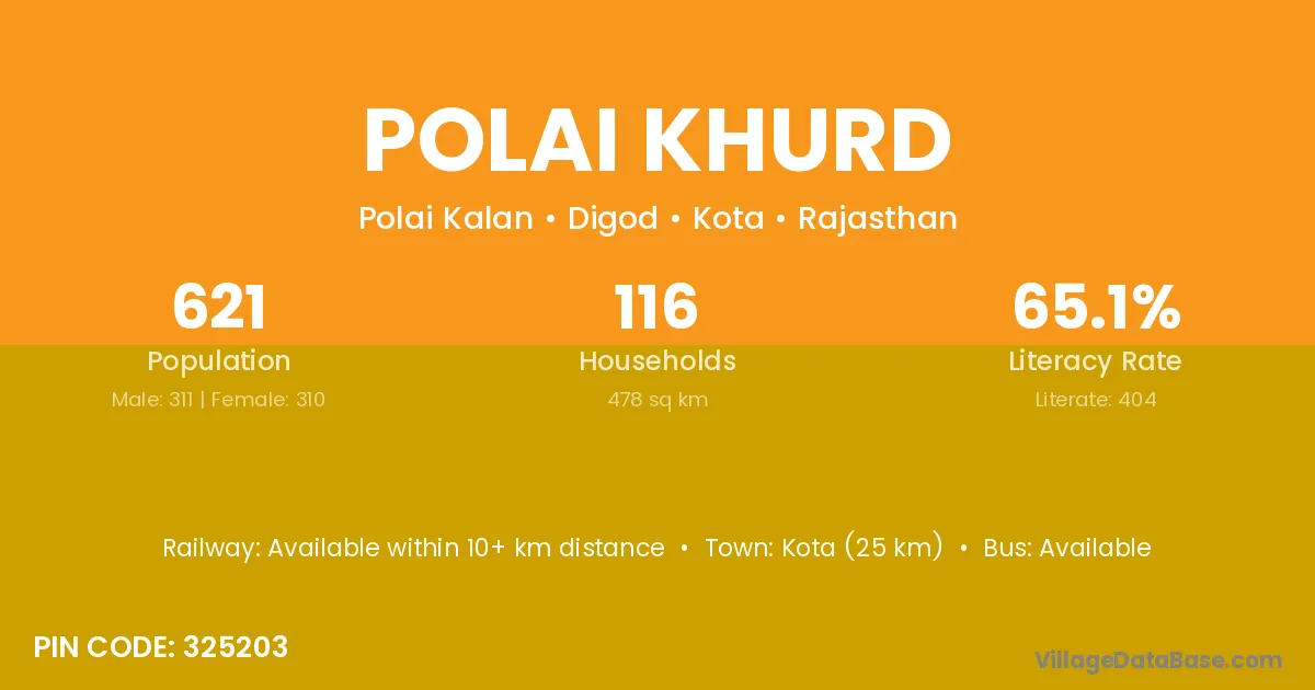 Polai Khurd village has a total population of 621 people, of which 311 are males and 310 are females.