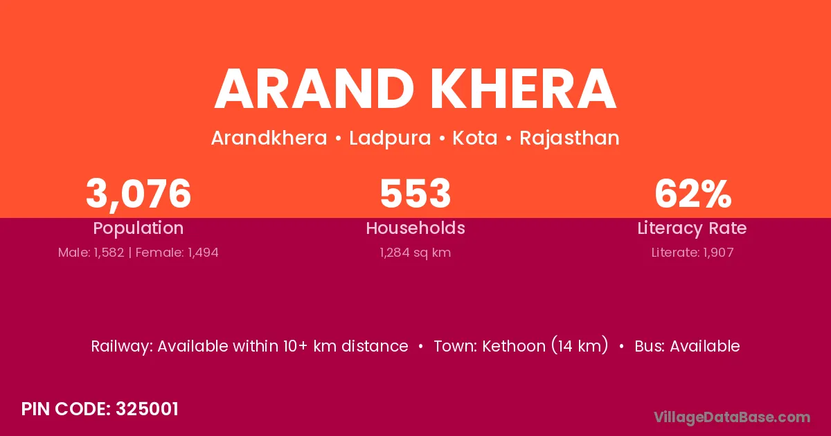 Kethoon (14 km) is the nearest town to Arand Khera village for major economic activities and is located approximately 14 km away.