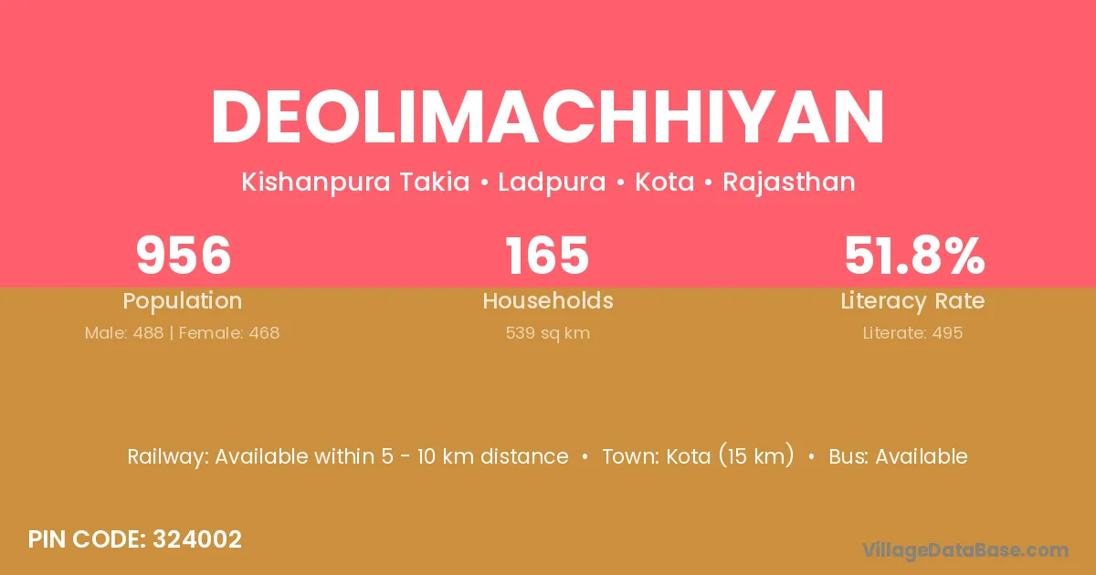 Kota (15 km) is the nearest town to Deolimachhiyan village for major economic activities and is located approximately 15 km away.