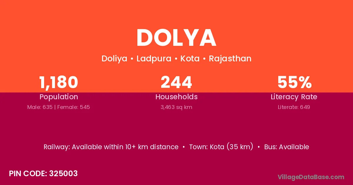 Kota (35 km) is the nearest town to Dolya village for major economic activities and is located approximately 35 km away.