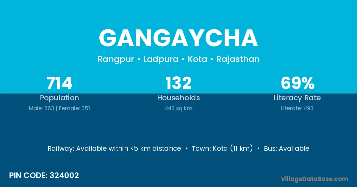 Kota (11 km) is the nearest town to Gangaycha village for major economic activities and is located approximately 11 km away.