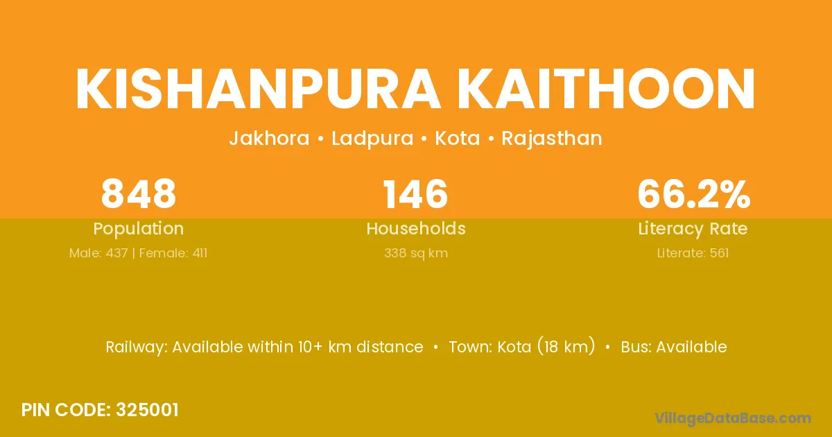 Kota (18 km) is the nearest town to Kishanpura Kaithoon village for major economic activities and is located approximately 18 km away.