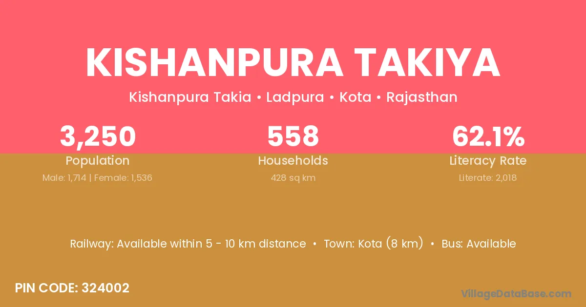Kota (8 km) is the nearest town to Kishanpura Takiya village for major economic activities and is located approximately 8 km away.