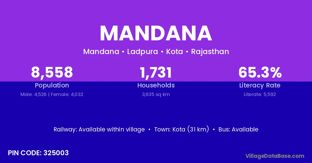 Kota (31 km) is the nearest town to Mandana village for major economic activities and is located approximately 31 km away.