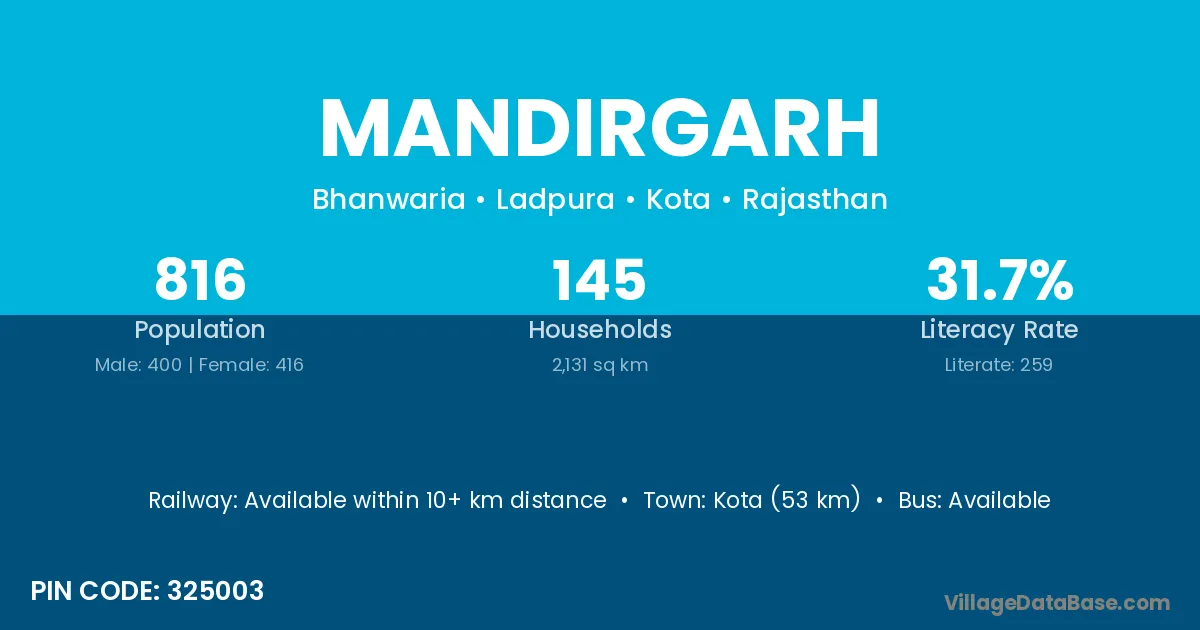 Kota (53 km) is the nearest town to Mandirgarh village for major economic activities and is located approximately 53 km away.