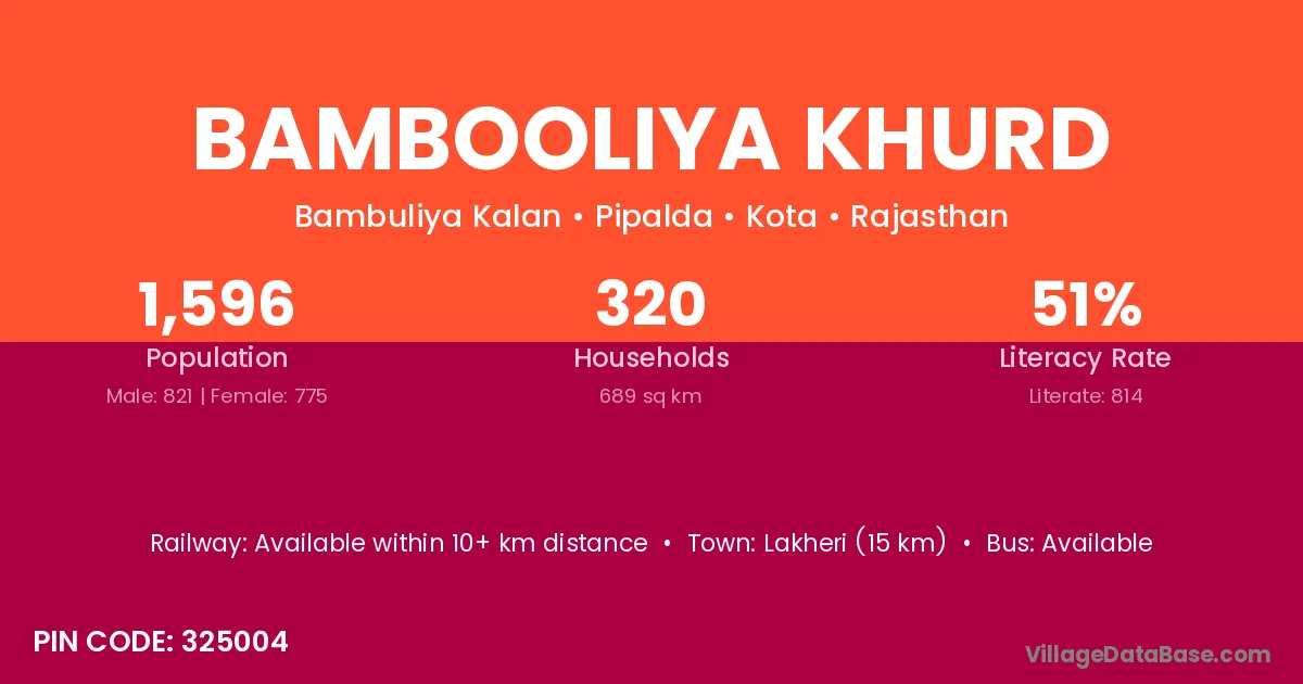 Lakheri (15 km) is the nearest town to Bambooliya Khurd village for major economic activities and is located approximately 15 km away.