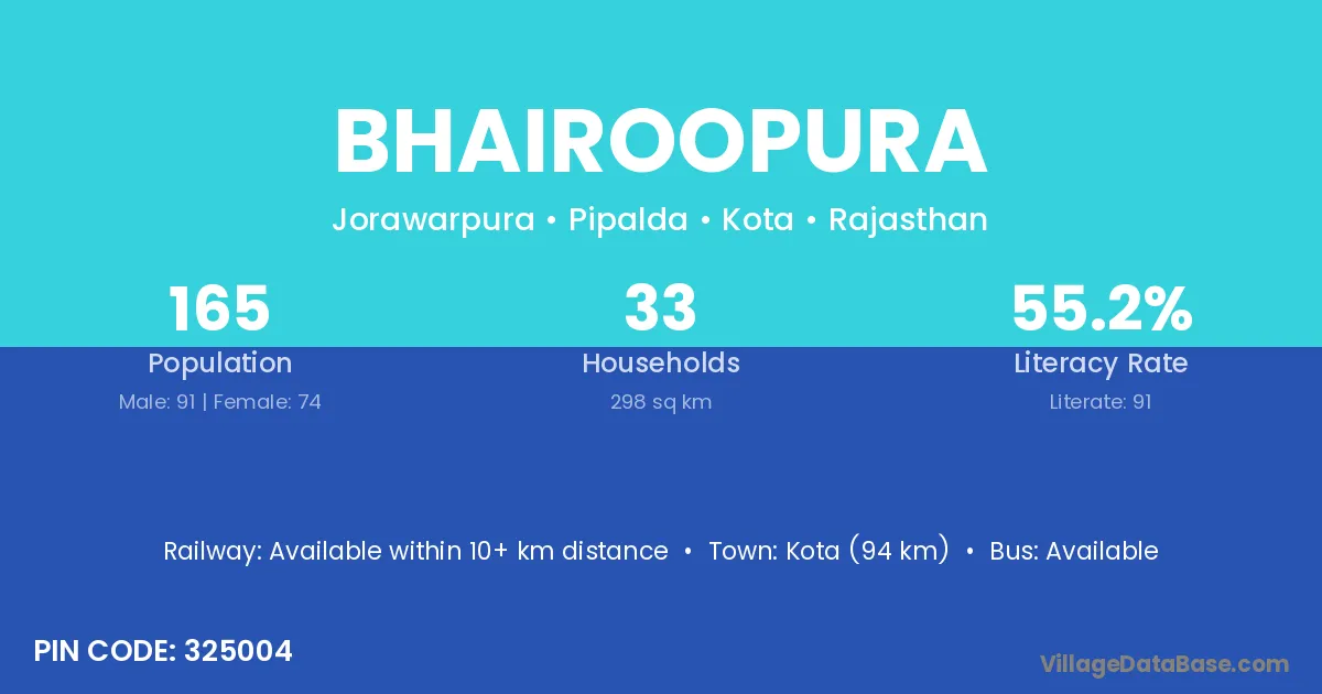 Kota (94 km) is the nearest town to Bhairoopura village for major economic activities and is located approximately 94 km away.