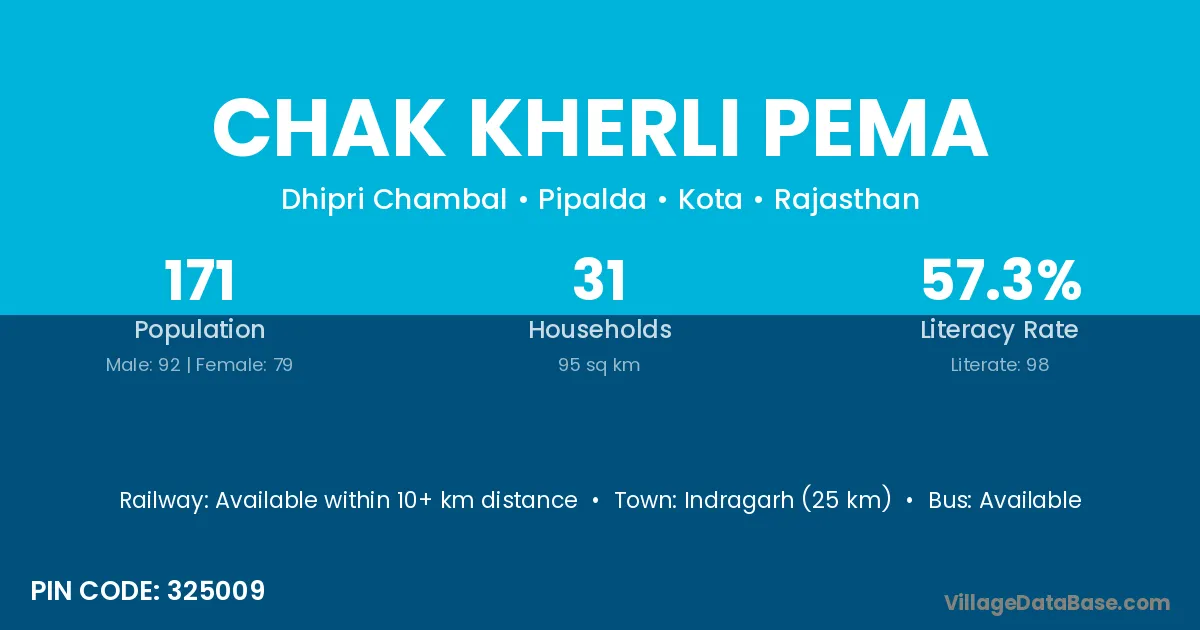 Indragarh (25 km) is the nearest town to Chak Kherli Pema village for major economic activities and is located approximately 25 km away.