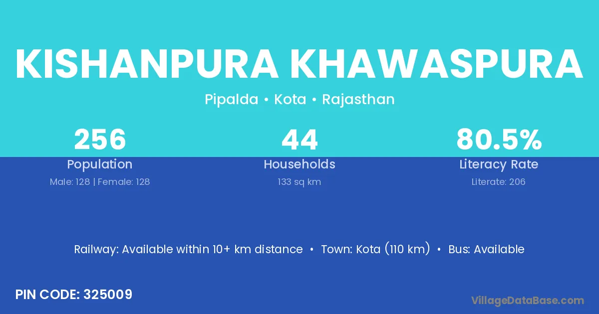 Kota (110 km) is the nearest town to Kishanpura Khawaspura village for major economic activities and is located approximately 110 km away.