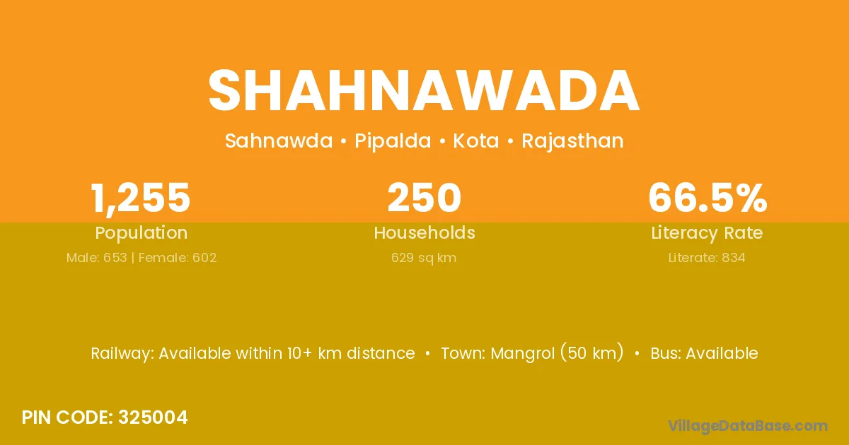 Mangrol (50 km) is the nearest town to Shahnawada village for major economic activities and is located approximately 50 km away.