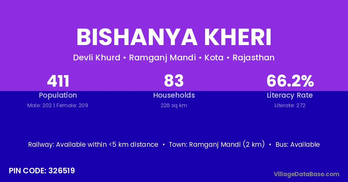 Ramganj Mandi (2 km) is the nearest town to Bishanya Kheri village for major economic activities and is located approximately 2 km away.