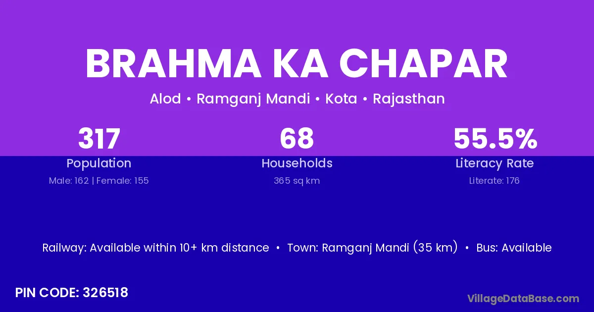 Ramganj Mandi (35 km) is the nearest town to Brahma Ka Chapar village for major economic activities and is located approximately 35 km away.
