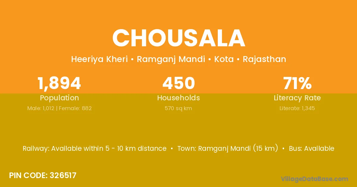 Ramganj Mandi (15 km) is the nearest town to Chousala village for major economic activities and is located approximately 15 km away.