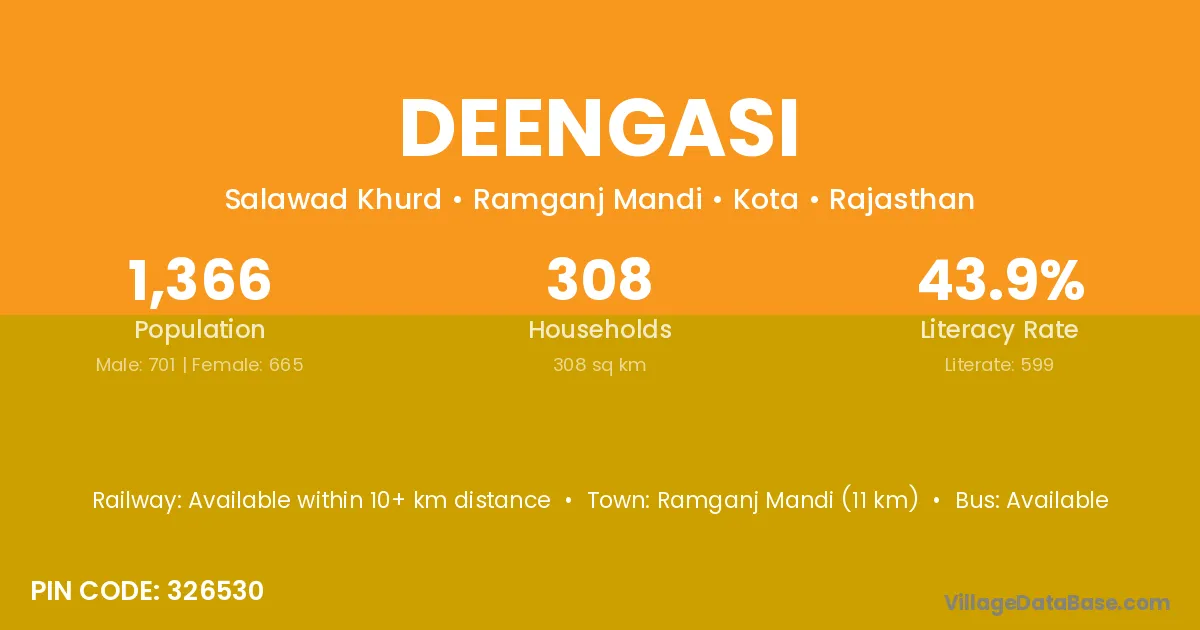 Ramganj Mandi (11 km) is the nearest town to Deengasi village for major economic activities and is located approximately 11 km away.