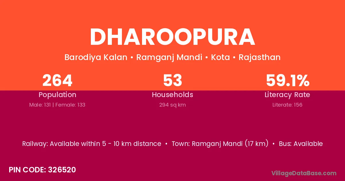 Ramganj Mandi (17 km) is the nearest town to Dharoopura village for major economic activities and is located approximately 17 km away.