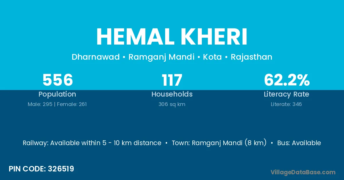 Ramganj Mandi (8 km) is the nearest town to Hemal Kheri village for major economic activities and is located approximately 8 km away.