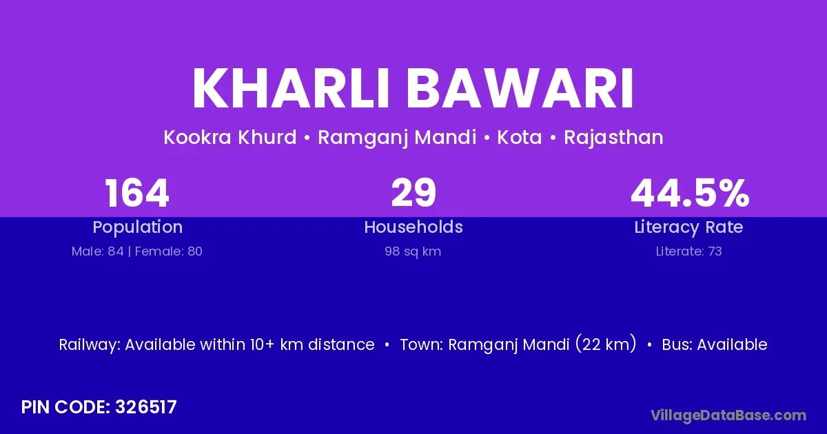Ramganj Mandi (22 km) is the nearest town to Kharli Bawari village for major economic activities and is located approximately 22 km away.
