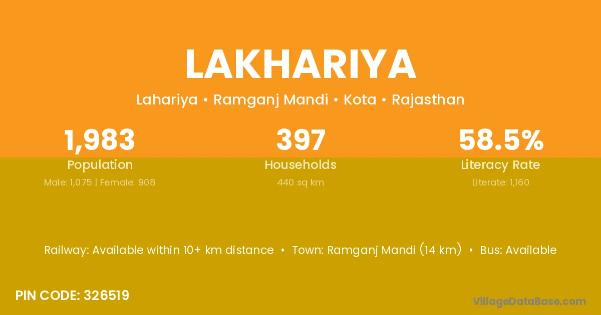 Ramganj Mandi (14 km) is the nearest town to Lakhariya village for major economic activities and is located approximately 14 km away.