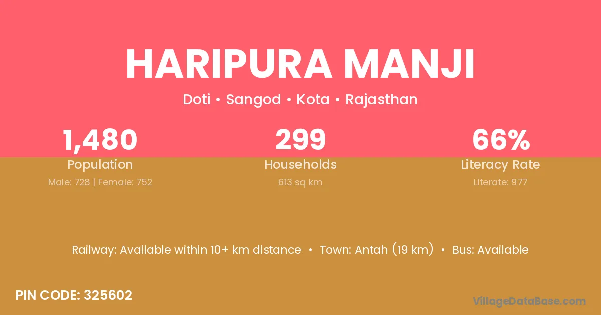 Antah (19 km) is the nearest town to Haripura Manji village for major economic activities and is located approximately 19 km away.