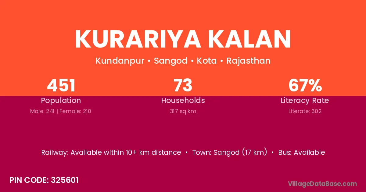 Kurariya Kalan village has a total population of 451 people, of which 241 are males and 210 are females.