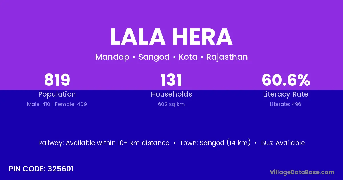 Sangod (14 km) is the nearest town to Lala Hera village for major economic activities and is located approximately 14 km away.