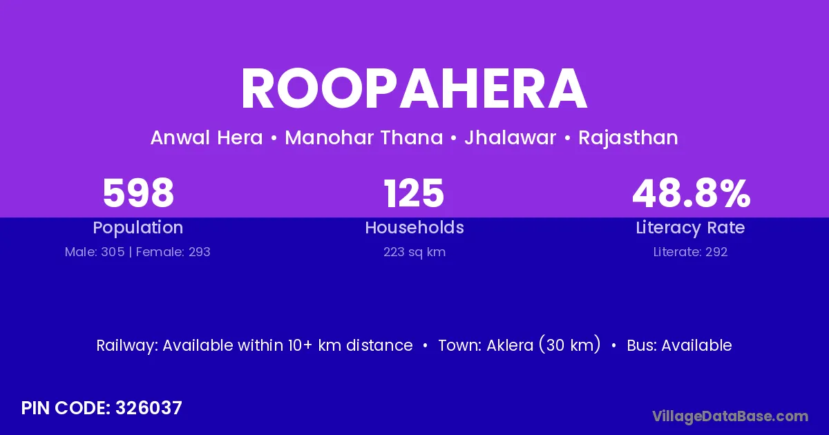 Sangod (18 km) is the nearest town to Roopahera village for major economic activities and is located approximately 18 km away.