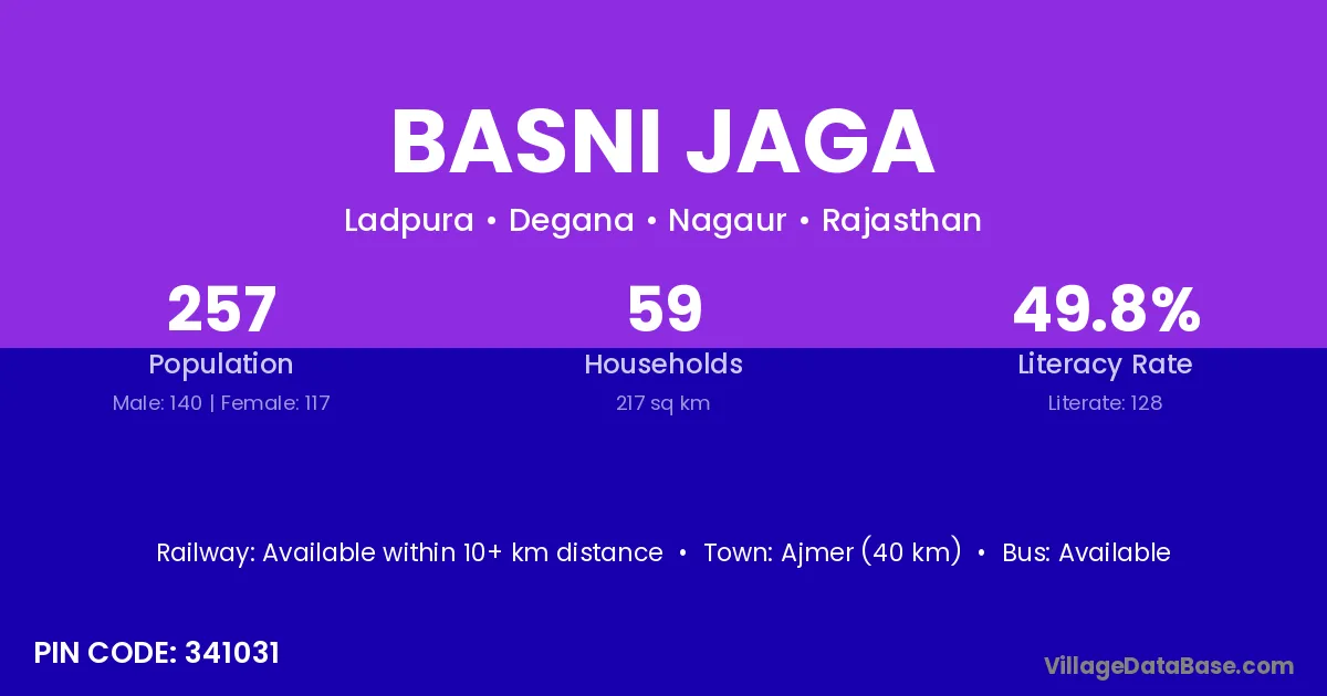 Ajmer (40 km) is the nearest town to Basni Jaga village for major economic activities and is located approximately 40 km away.