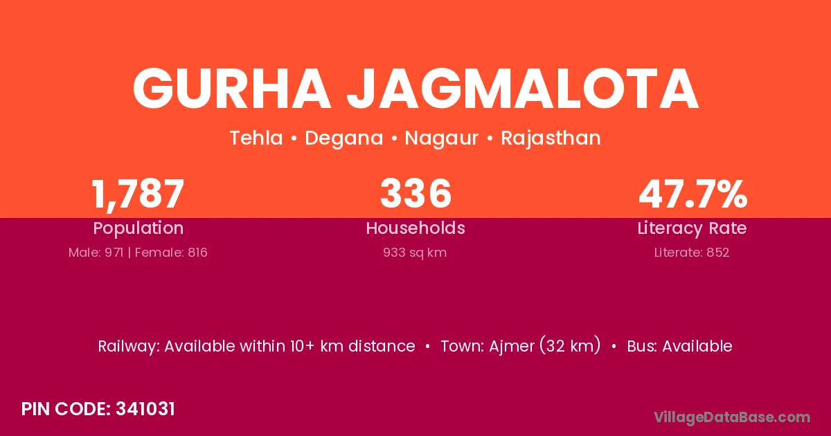 Gurha Jagmalota village has a total population of 1,787 people, of which 971 are males and 816 are females.