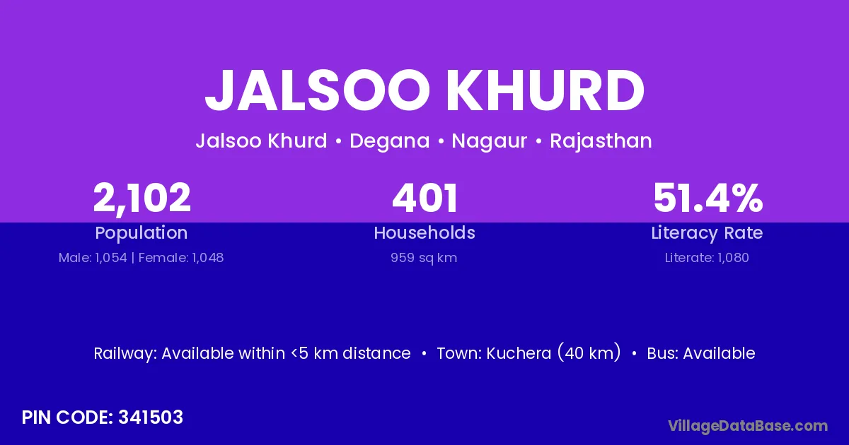 Kuchera (40 km) is the nearest town to Jalsoo Khurd village for major economic activities and is located approximately 40 km away.
