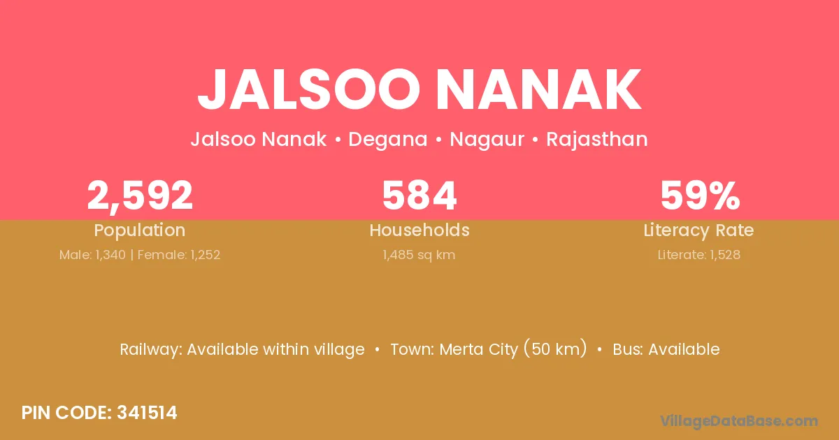 Merta City (50 km) is the nearest town to Jalsoo Nanak village for major economic activities and is located approximately 50 km away.