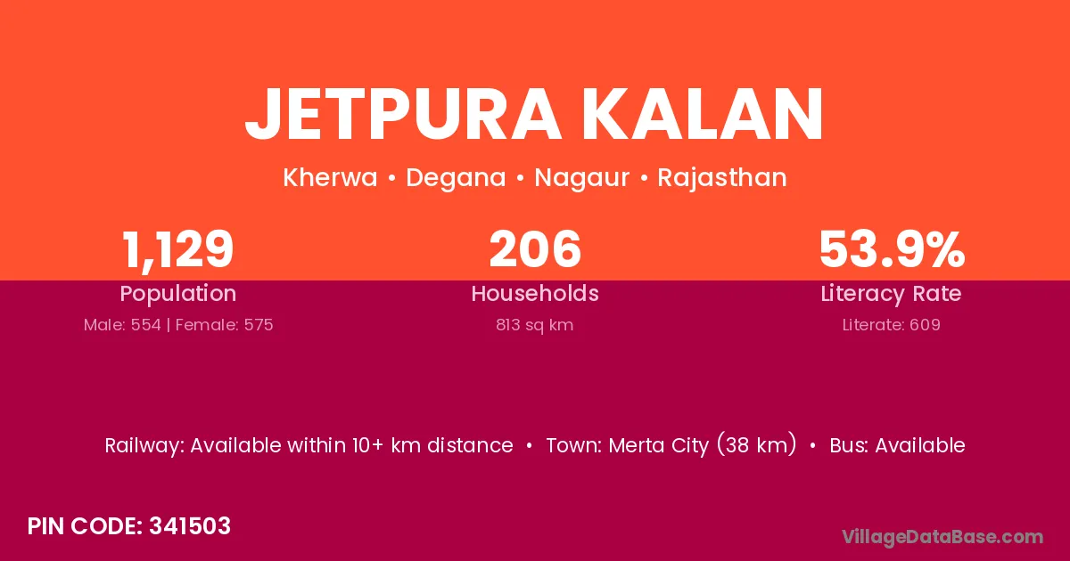 Merta City (38 km) is the nearest town to Jetpura Kalan village for major economic activities and is located approximately 38 km away.