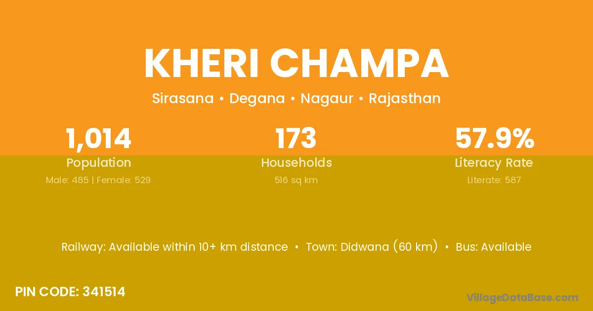 Didwana (60 km) is the nearest town to Kheri Champa village for major economic activities and is located approximately 60 km away.