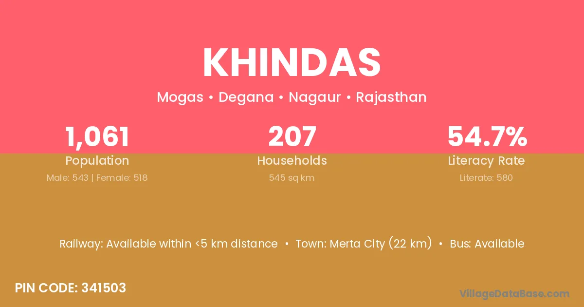 Merta City (22 km) is the nearest town to Khindas village for major economic activities and is located approximately 22 km away.