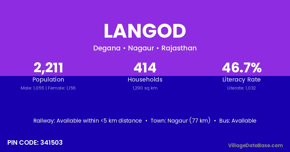 Nagaur (77 km) is the nearest town to Langod village for major economic activities and is located approximately 77 km away.