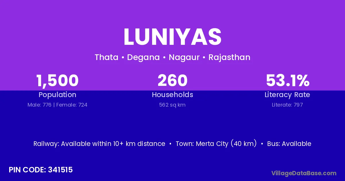 Merta City (40 km) is the nearest town to Luniyas village for major economic activities and is located approximately 40 km away.